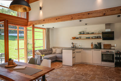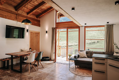 Sie bietet 2 geräumige Schlafzimmer, für 4 Personen, mit wunderbaren Massivholzböden und traumhaften Zirbenholzbetten für besonders erholsamen Schlaf. Einen großzügigen und lichtdurchfluteten Wohn-/Essbereich mit integrierter vollausgestatteter Küche mit Geschirrspüler.
